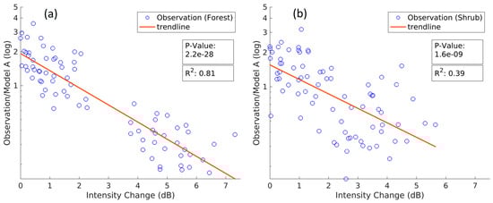 Semi-logarithmic scatter plot of coherence ratio, i.e., observation/model A, versus the relative intensity changes for forested (a) and shrub (b) land cover types.