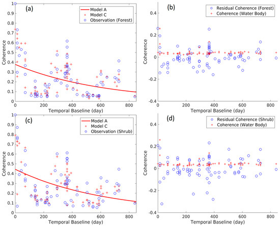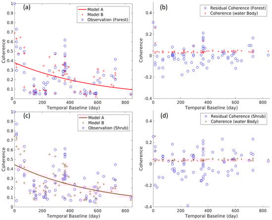 Scatter plots of observations and model B for forested (a) and shrub (c) land cover types. Scatter plots of residual coherences (observation—model B) for forested (b) and shrub (d) land cover types. Plot of model A and the scatter plot of coherence of water body are shown for comparison.