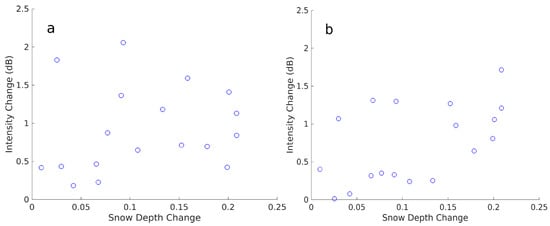 Different snow depths between two images of an interferometric pair is one of the factors that can induce variations in surface scattering behavior, which, in turn, leads to decorrelation. Basically, between two winter images in stable frozen conditions with no change in soil moisture, the change in the dielectric constant is negligible and high coherence values can be expected for open areas [34]. However, the change in snow depth between the two images may change the surface scattering behavior, which, in turn, causes decorrelation. Here, we intend to modify our coherence model by adding the decorrelation term of snow depth changes. The basic assumption here is that the intensity and snow depth changes are independent parameters, i.e., a systematic snow depth change does not produce a systematic intensity change. Figure 5, illustrating the scatter plot of the intensity change versus snow depth changes, shows no trend and indicates that the two parameters are independent.