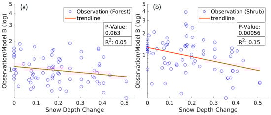 Semi-logarithmic scatter plot of the coherence ratio, i.e., observation/model B, versus snow depth changes (meter) for forested (a) and shrub (b) land cover types.