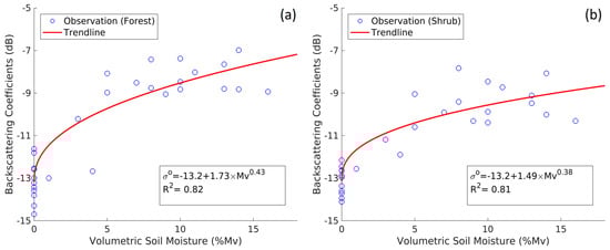 Plot of the change in SAR intensity for forested (a) and shrub (b) land cover types versus the change in soil moisture measured at the SNOTEL Site Granite Creek (963) (Natural Water and Climate Center (https://wcc.sc.egov.usda.gov)). Data under frozen and unfrozen conditions are included.