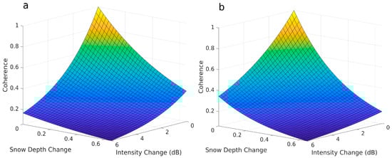 Figure 9 depicts coherence as a 3D surface and provides a visual comparison of coherence evolutions of the two land cover types: forested and shrub. The x-axis of the plot is the relative change in SAR intensity and ranges between 0 and 0.65, i.e., the maximum measured relative intensity change, whereas the y-axis is the change in snow depth and ranges between 0 and 0.65 m. It is shown that both land cover types, even with the short temporal baselines, can lose coherence due to the changes in the dielectric constant and snow depth. Additionally, it is illustrated that the forest loses coherence with a higher rate than the shrub landscape with changing backscattering (dielectric constant), whereas the shrub landscape is more prone to decorrelation as the change in snow depth between two images increases.