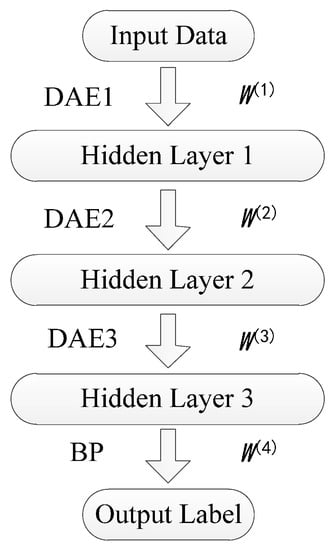 The learning process of SDAE has two steps: unsupervised learning and supervised learning. First, unlabeled samples are used for denoising autoencoder’s greedy layer-wise training, in which raw data is used to feed the first layer of DAE for unsupervised training, and then the parameter of the first hidden layer is obtained. In each subsequent step, the front trained layers as input are used to train the th layer and obtain the parameter . The weight from training of each layer is taken as the weight of the final deep network’s initialization. Second, BP neural network with labeled data is carried out for supervised learning. While getting parameters of the associated feature and category of the last layer, the parameters of the entire network are fine-tuned by error back propagation so that the parameters converge to the position that is in or near the global optimum.