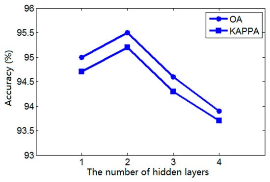 The impact of the number of SDAE hidden layers on classification accuracy.