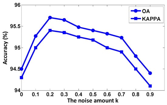 In the pre-training process of SDAE, in order to learn more useful features from the original data and enhance the robustness of the model, noise was manually added to the DAE input of each layer. Specifically, according to the proportion k, the input unit of DAE is randomly set to 0 in each training process, while AE of each layer in SAE directly uses training data. In order to explore the effect of denoising pre-training and the impact of different levels of noise added to the training data on the classification ability of the model, we choose a different k ranging from 0 to 1 for the experiment and compare the experimental results with SAE. The selected SAE model has the same network structure as that of SDAE model, the number of hidden layers is 2, and each layer has 180 units. The experimental results are shown in Figure 7.