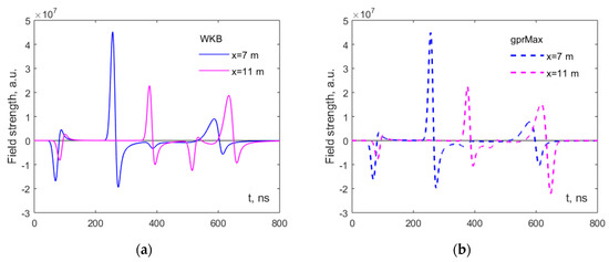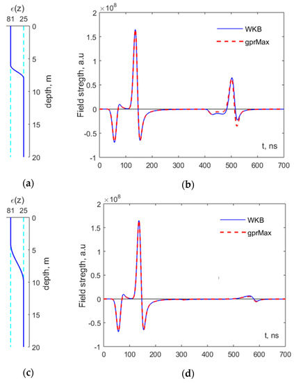 corresponds to a transition layer which is located in for Figure 5a, and m for Figure 5c. The distance between the transmitter and receiver antennas is . In Figure 5b,d, synthetic radargrams (A-scans) are presented for the scenarios of Figure 5a,c, respectively. Simulations were performed using both our coupled-WKB method (solid line) and gprMax (dashed line). The first double pulse corresponds to the direct surface wave, propagating along both sides of the ground-air interface. A weak signal with longer delay arises due to the cumulative partial reflection from the non-uniform transition layer.