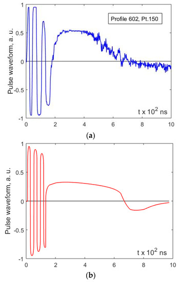 According to divers’ witnesses, the bottom of the lake was covered with a soft silt layer, 2–3 m thick. The experienced “Loza-N” operators assumed that the protracted signals received by the GPR were due to partial reflection from such a loose silt layer. Our numerical simulations with coupled-wave WKB confirm this hypothesis. Indeed, in Figure 7a we present an experimental A-scan showing the aforementioned effect of cumulative partial reflection from a thick layer of bottom sludge; and in Figure 7b we display the numerical results obtained within the framework of our coupled-WKB approximation.