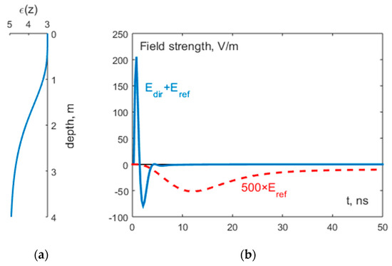 We finally present another possible application of the developed method, namely the interpretation of data that could be obtained by GPR probing the lunar regolith during a planned space mission. It is known that a considerable amount of ice is accumulated in lunar regolith near the poles, which may be used in future space missions. To localize and estimate the available volumes of water, mechanical drilling of lunar regolith [37] can be complemented with GPR probing. The example presented in Figure 8 shows that our semi-analytical approach can be successfully used to model and simulate the electromagnetic propagation of a GPR pulse in the upper regolith layer, characterized by smooth gradients of dielectric permittivity due to the changing ice proportion. For this example, we calculate synthetic A-scans and the reference regolith parameters are taken from the literature [33]. A typical permittivity profile is plotted in Figure 8a and the corresponding A-scan is presented in Figure 8b. The main received signal is a bipolar pulse due to the direct wave propagating from the transmitting to the receiving antenna. The backward reflection is too weak to be seen in the scale of the plot, we therefore multiplied it by and plotted it as a separate curve. Its waveform reveals the cumulative character of the return signal, which is a superposition of partial reflections from the non-uniform transition layer. Despite the weak power level, the backward reflection can be confidently detected with a deep penetration GPR [36]. Valuable information on the smooth subsurface inhomogeneity can be retrieved by comparing simulation results produced with our method and experimental results.