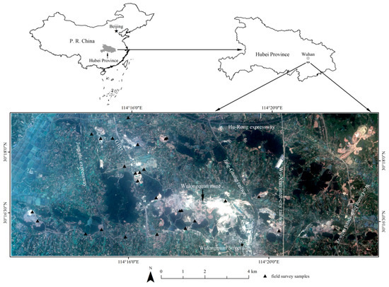 In this study, a test site with area of 109.4 km2 located in Wuhan City of China (114°12′33.59″E–114°23′6.89″E and 30°15′38.85″N–30°18′57.48″N) was selected for the analysis (Figure 1) [14]. Surface mining is prominent features of the test site. The mine disturbance here has a history of nearly 60 years, and most of the mines are active nowadays, especially the Wulongquan mine. The test site also covers a variety of agricultural activities such as crop cultivation (e.g., rice, cotton, corn, rapeseed, and wheat), greenhouse farming, forestry, and aquaculture [14]. The test site is located in the subtropical humid monsoon climate zone, and the annual average temperate is 15.9–17.9 °C. The rainfall is concentrated in the rainy season of early summer with an annual average rainfall amount of about 1347.7 mm. Several national road networks pass through the test site (Figure 1). The locations of the 28 field survey samples are shown in Figure 1, which is the same as our previous research [14].