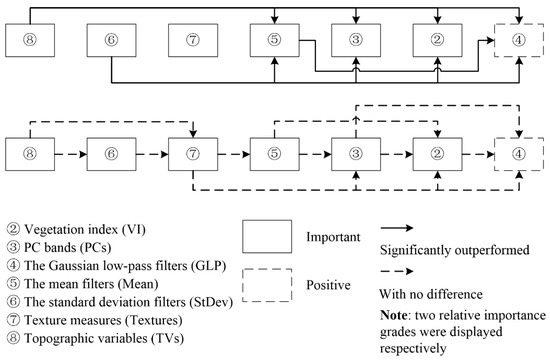 The relative importance of StDev and TVs according to the results derived in Section 3.2, Section 3.3 and Section 3.4 was inconsistent. Considering Section 3.2 and Section 3.4 supported that TVs slightly outperformed StDev, especially in Section 3.2 the size of TVs was smaller than that of StDev, the conclusion from Section 3.2 and Section 3.3 was adopted (Figure 4). AS for the relative importance between TVs and the GLP and Mean, Section 3.2 agreed with Section 3.3 that TVs significantly outperformed GLP and slightly outperformed Mean. However, Section 3.4 indicated that TVs significantly outperformed GLP and Mean. Considering the sizes of used features from Mean and TVs were commensurate in Section 3.4, the conclusion from here was adopted (Figure 4). As for the relative importance between TVs and VI, and TVs and PCs, the results in Section 3.2 could not provide any additional information, and significant differences were detected in Section 3.3. Accordingly, TVs significantly outperformed VI and PCs (Figure 4). Because Textures slightly outperformed Mean and GLP, it could be drawn that Textures slightly outperformed VI and PCs.