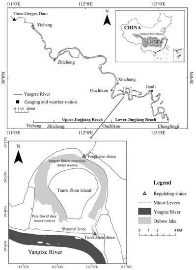 The lower Jingjiang reach of the Yangtze River is known for its meanders with a high degree of channel sinuosity [,]. Due to a series of natural and artificial cut-offs since the 1880s, several oxbow lakes remain along the river bank on the floodplain [,]. With the implementation of some major water projects, including the Three Gorges Dam and the Gezhouba Dam [,], as well as river regulation and flood control projects [,], the hydrologic regime in the lower Jingjiang reach and the oxbow lakes have been greatly altered in recent decades.
