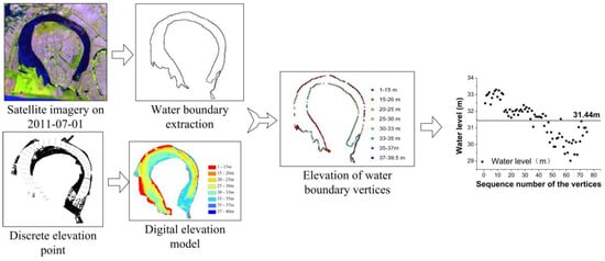 A flowchart of the water level data extraction in the oxbow lake on 1 July 2011, by using the WBET method (the average elevation of vertices on the water boundary is regarded as the water level on 1 July 2011, namely 31.44 m).