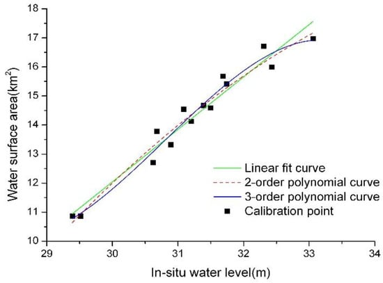 Given the highly correlated relationship between the water surface area and the in situ water levels in the oxbow lake, the water surface area–lake level fitting curves were constructed. Three fitting curves were constructed by using the LRC method, as shown in Figure 3. The results show that all of the curves produced a good fit for the relationship between the water level and the lake surface area in the Tian-e-Zhou oxbow lake (Table 1). Even a simple linear fitting curve can be used for the water level data extraction with an RMSE of 0.219 m and an R-squared value of 0.949. The lake water levels at other times could then be estimated using this empirical model.