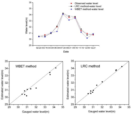 We used in-situ measurements of water level data (10 points) in 2010 to validate the observed results and confirm the accuracy of the two methods. The temporal comparison of the two methods with the observed data is shown in Figure 4. The quality indicators, including assessments of RMSE, MRE, and R, are shown in Table 2. The results indicated that the two methods exhibited a good agreement with the in situ data (red line in Figure 4) during the comparison time span. The LRC method maintained RMSE and R values of 0.168 m and 0.994, respectively, whereas the WBET method had RMSE and R values of 0.386 m and 0.975, respectively (Table 2). The small errors and high correlation coefficients indicated the feasibility of the two methods in estimating the water level in the oxbow lake.