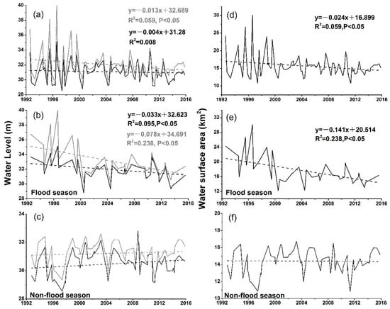 Temporal changes in water level and water surface areas during the flood and non-flood seasons of the Tian-e-Zhou oxbow lake from 1992–2015. (a,d) show the total water level and the water surface area variation during 1992–2015, respectively. (b,e) show the water level and the water surface area variation in the flood season (from June–September) during 1992–2015, respectively; and (c,f) show the water level and the water surface area variation in the non-flood season (from October–May) during 1992–2015, respectively. The black and grey lines in (a–c) show the water level extracted by using the WBET and LRC methods, respectively.