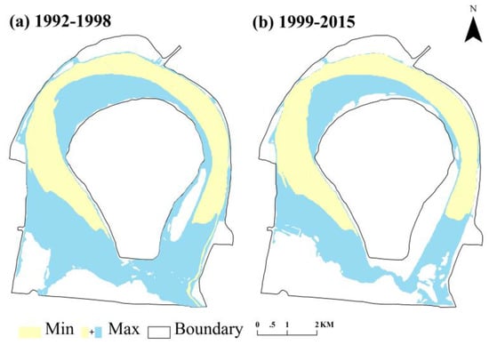 Minimum and maximum water surface areas in the two observed periods: (a) 1992–1998; (b) 1999–2015.
