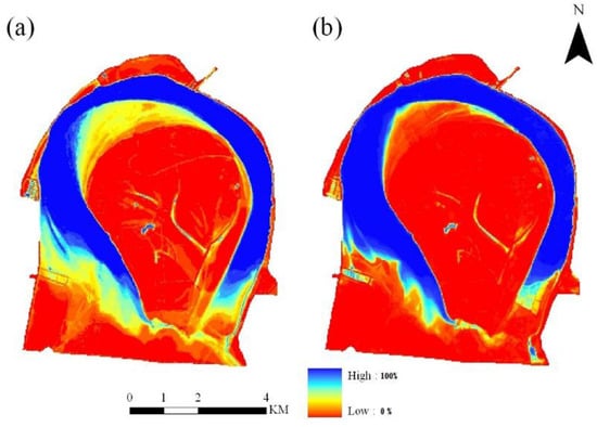 The inundation frequencies in (a) 1992–1998 and (b) 1999–2015 in the oxbow lake.