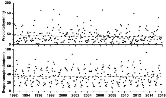 The long-term precipitation and evapotranspiration in the Tian-e-Zhou oxbow lake between 1992 and 2015. The linear fitting line did not show an obvious synchronous change of the two climate factors.