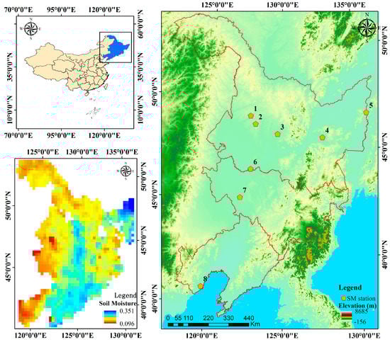 The three provinces of Northeast China, namely Heilongjiang, Jilin, and Liaoning Provinces, were chosen for this case study. They span approximately 787,300 km2 within 38.72°N–53.59°N and 121.00°E–135.19°E (Figure 1). The terrain in Northeast China is mainly dominated by plains and mountainous areas. Owing to the high latitude, this region generally belongs to the cold and mid-temperate monsoon climate with cold, long winters and warm, short summers. The annual precipitation is 300–1000 mm and is mainly concentrated in the summer. As one of the major grain crop producing regions in China, the whole area is renowned for its fertile black soil and deep soil layer. However, the coarse pixel resolution (0.25°) could hardly reflect the regional SM distribution or satisfy the high accuracy requirement for irrigation analysis of agricultural production. Eight SM stations were acquired from the Crop Growth and Soil Moisture Values in China datasets provided by China Meteorological Science Data Sharing Network []. There were five different depths of observation layers, which were 10 cm, 20 cm, 50 cm, 70 cm and 100 cm. Considering that microwave remote sensing only penetrates 3–5 cm of the earth’s surface, the 10-cm data were utilized in this study. In addition, we converted the relative humidity of the observed SM into volumetric water content using Equation (1) to maintain consistency with ECA CCI SM data. The soil bulk density data and field moisture capacity data [,] were derived from the Land and Gas Interaction Research Group, Beijing Normal University (Beijing, China).