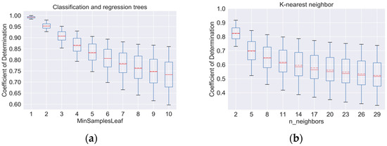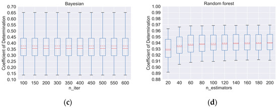 Variations of coefficient of determination with different selected parameters of: (a) classification and regression trees; (b) K-nearest neighbors; (c) Bayesian; and (d) random forest.