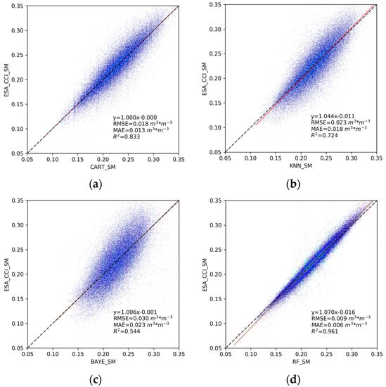 Scatterplots, linear regression equations, RMSEs, MAEs and R2 between ESA CCI SM and: (a) CART_SM; (b) KNN_SM; (c) BAYE_SM; and (d) RF_SM.