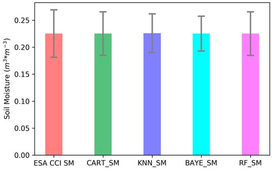 Comparison of ESA CCI SM, CART_SM, KNN_SM, BAYE_SM and RF_SM by error bars.