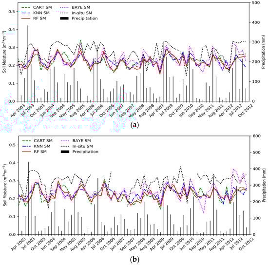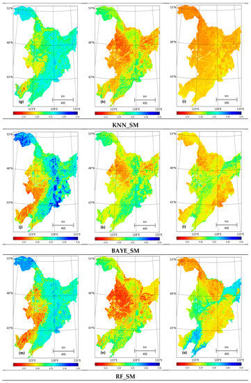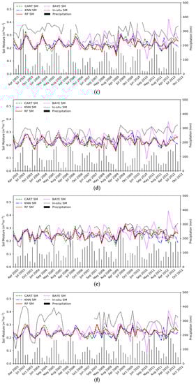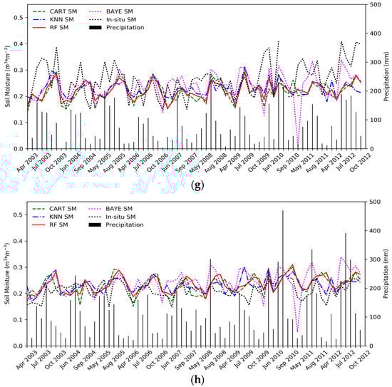 Equally, the performance of the downscaled SM was diverse among the specific methods. It is known that CART and RF are tree-based algorithms, and thus, there is a consistency in the variation tendency of the two data series. Nonetheless, CART_SM showed a few of unusual extreme values (larger peak value in October 2010 in Figure 6b and smaller valley value in August 2004 in Figure 10h than the other downscaled SM results). By contrast, RF_SM displayed relative robustness and consistency with proper values, demonstrating corresponding variation tendency and reasonable extreme values with precipitation and in-situ measurements as well. The variation tendency of KNN_SM was relatively consistent with the whole trend, but there were still some dissimilarities. For example, KNN_SM showed a peak in April 2004 in Figure 10a, whereas all the other SM results as well as precipitation present a valley at the same time. In addition, the fluctuation curve of KNN_SM was more like that of BAYE_SM; this may be because, during the regression progress, both KNN and BAYE mainly take the nearby important point values into consideration when predicting SM. BAYE_SM shows noticeably abnormal peak and valley values compared to the other downscaled SM and in-situ measurements. In general, the BAYE algorithm expressed an unstable performance in peaks and valleys during the downscaling progress.