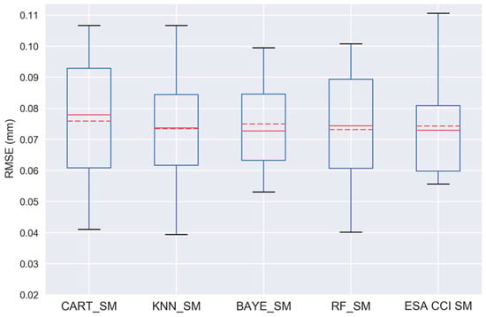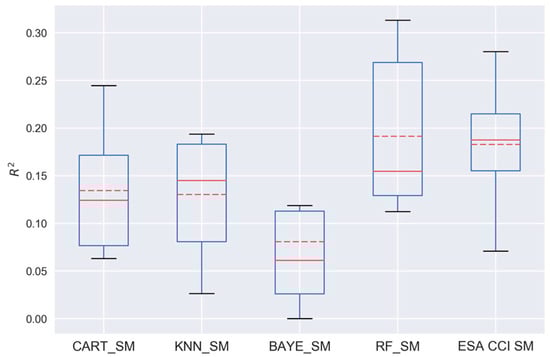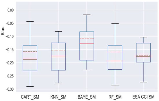 The in-situ measurements from eight sites were utilized to validate the downscaled SM data. The RMSE, MAE, Bias, and R2 were calculated. The results are shown in Table 3. We found that, in terms of R2, RF showed the superior coefficient of determination (R2 = 0.191), CART (R2 = 0.135) ranked second, followed by KNN (R2 = 0.13), and BAYE had the lowest R2 value (R2 = 0.081). In addition, BAYE performed, to some extent, better than the others in terms of Bias. Furthermore, RF and KNN revealed fairly good performance for Bias. The downscaled results produced by using the CART model had the worst accuracy of all the algorithms. The fluctuation of deviation between downscaled data and measurements was relatively small in general. Figure 7, Figure 8 and Figure 9 show the error boxplot of R2, RMSE (m3·m−3) and Bias, which are more intuitive than the numerical figures in Table 3. We can clearly see the mean, median, 75 and 25 percentiles, and maximum and minimum values of each index.