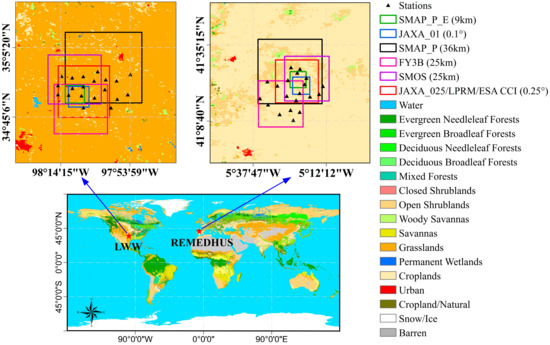 In this paper, in-situ soil moisture data were collected from two well-calibrated and dense networks, being the LWW network [29] in the United States and the REMEDHUS network [30] in Spain. The locations of the two networks and their corresponding sites are shown in Figure 1. The reasons for selecting the two network regions as our study areas consist of two aspects. First, high-quality and dense in-situ measurements can be measured from both networks, which can reduce the scale-related issue between the ground-based point and satellite pixel. It is known that soil moisture has high spatial variability, thus measurements from a single station cannot generally represent the retrievals of a satellite pixel. Fortunately, dense in-situ measurements can be measured in the two network regions, and the averaged spatial measurements from multiple stations can therefore reduce the inherent spatial issue as much as possible [16,20,21]. Second, the two network regions have different land covers (i.e., grasslands in LWW and croplands in REMEDHUS, see the Moderate Resolution Imaging Spectroradiometer (MODIS) International Geosphere Biosphere Program (IGBP) land cover in Figure 1), which can provide a more robust evaluation of the satellite soil moisture products. The details of the two networks are described below.