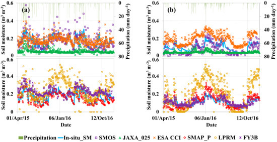 Temporal evolution of the station-averaged soil moisture and satellite soil moisture with a spatial resolution of 0.25° for the (a) LWW and (b) REMEDHUS networks. Soil moisture products are divided into the vertically-oriented panels in (a,b) for visualization purposes.