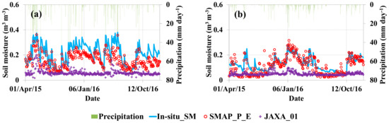 AMSR2 was carried on the Global Change Observation Mission-1st Water (GCOM-W1) satellite. It was launched by the Japan Aerospace Exploration Agency (JAXA) on 18 May 2012, and started to acquire scientific observations on 3 July 2012. It scans the Earth’s surface in an ascending (1:30 P.M. local solar time) and descending (1:30 A.M. local solar time) mode. AMSR-2 is a successor to the AMSR-E, which operated from May 2002 to October 2011, and provided the first standard soil moisture product [2,16]. AMSR2 provides passive microwave measurements on fourteen channels, with frequencies ranging from 6.9 GHz to 89.0 GHz at H and V polarizations. Two soil moisture products derived from AMSR2, i.e., the JAXA and LPRM soil moisture products, are released to the public, and therefore used in the study.