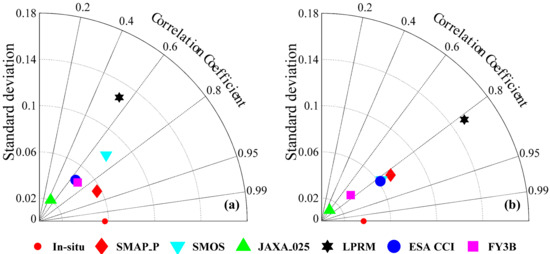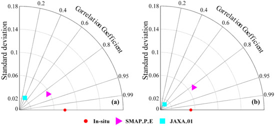 The Taylor diagram [60] has been used to provide a brief statistical summary of how closely the datasets match observations in this paper, since the diagram can demonstrate the performance of various products in a single diagram in terms of the correlation coefficient, centered RMSE (i.e., ubRMSE), and standard deviation. During nighttime or morning time (e.g., from 0:00 A.M. to 6:00 A.M.), the thermal equilibrium builds up among the vegetation, air, and topsoil, which makes the basic assumption that vegetation temperature and topsoil temperature are equal in the soil moisture retrieval algorithms more reliable. Therefore, all satellite soil moisture products—except the ESA CCI product, which is provided on a daily basis—are evaluated at their nighttime or morning time overpass (i.e., 6:00 A.M. for SMAP and SMOS, 1:30 or 1:40 A.M. for FY3B and AMSR2, daily for ESA CCI). Figure 2 shows the temporal behavior of the station-averaged soil moisture at different times (daily, 1:30 A.M. and 6:00 A.M.) for the two network regions. It can be seen that the difference between the ground station-averaged soil moisture at different times is very small. That is to say, the time series, station-averaged soil moisture measurements at 1:30 A.M. and at 6:00 A.M. are nearly equal, which are also nearly equal to the daily station-averaged soil moisture measurements. Therefore, we use the daily, station-averaged in-situ measurements to examine the performance of the satellite soil moisture products in our study [16,19].