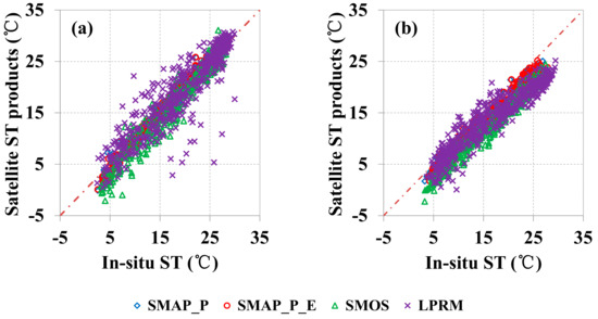Many factors impact the validation accuracy of satellite soil moisture products, including (1) the uncertainties originating from the well-known horizontal and vertical mismatch between in-situ soil moisture and satellite observations (commonly, the effective soil moisture sampling depth at the L-band and C/X-band is 0–3 cm and 0–1 cm, respectively, and also depends on soil moisture [16,22], while the ground soil moisture is measured at 5 cm); (2) the possible errors in ground measurements; (3) the effects of RFI; and (4) the inaccurate correction of the perturbing factors (e.g., surface temperature, vegetation, and surface roughness) in the soil moisture retrieval algorithm [23]. In contrast to active microwave backscatter, which is nearly unaffected by surface temperature, the passive observations are heavily controlled by temperature. Thus, the effects of surface temperature must be eliminated for reliable soil moisture retrievals [10]. In SMAP and SMOS soil moisture retrieval algorithms, the surface temperatures are all derived from model simulations. The SMAP surface temperature is predicted from the NASA GEOS-5 model, and SMOS surface temperature is obtained from the ECMWF model. In contrast, in LPRM, the surface temperature is retrieved separately from the 36.5 GHz V-pol brightness temperature. In the FY3B algorithm, a similar approach to LPRM is adopted to correct the effects of surface temperature, but the surface temperature data is not provided at present. For the JAXA algorithm, the PI and ISW are applied to minimize the effects of surface temperature to retrieve soil moisture. Therefore, in this section, we examine the accuracy of the surface temperature provided by the SMAP, SMOS and AMSR2 (LPRM) products, shown in Figure 7. It should be noted that in the SMOS algorithm, a two-layer algorithm [9] is adopted to calculate the effective soil temperature, which can eliminate the influence of temperature more effectively. However, in the SMOS CATDS product, only the soil temperature of the first layer from ECMWF (i.e., Temp_STL1) is provided. In our study, the SMOS surface temperature ancillary data we examined is the Temp_STL1 product, which is not the actual soil effective temperature used in the SMOS algorithm.