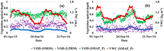 In this study, we examined the temporal variations of the vegetation optical depth derived from SMAP, SMOS, and LPRM, as well as the VWC extracted from SMAP passive soil moisture product, as shown in Figure 8. It can be observed that the LPRM τc had a much larger value than SMAP and SMOS τc. A high τc value indicates a low transmissivity of the vegetation, which may lead to low soil emissivity. It is known that soil emissivity generally decreases as soil moisture increases. Thus, it may be possibly deduced that the high LPRM soil moisture is caused by the high estimated τc value. Additionally, it can be seen that the SMAP τc shows much smoother variation than SMOS and LPRM during the entire period. The SMOS τc seems noisy, leading to a very large dynamic range of τc (>0.4) in the two network regions. In general, an increase of vegetation biomass leads to an increase of vegetation optical depth. Thus, in theory there should be a positive correlation between τc and VWC. However, SMOS τc does not show significant correlations with VWC, with a correlation coefficient of 0.26 and 0.03 in the LWW and REMEDHUS network regions, respectively. In contrast, LPRM τc shows a good response to VWC, with a correlation coefficient of 0.39 in the LWW network region and 0.68 in the REMEDHUS network region. Meanwhile, it is worth mentioning that the SMAP-derived VWC is not the real vegetation water content seen by the microwave. This is because the optical wavelength is much smaller than the microwave, and can only represent the information of a very thin layer of the vegetation canopy. In contrast, the microwave is able to penetrate vegetation to some extent, and thus contains some information of the vegetation stem and branches. This is more evident at the L-band than at the C-band and X-band, leading to the lower correlation of the L-band with NDVI VWC than that of the C-band and X-band. The SMOS-retrieved τc exhibits a day-to-day variability, which is not consistent with the actual changes in the vegetation. This is in line with the finding reported in [19]. Thus, the variation in SMOS τc should be one error source in the SMOS soil moisture product. A new vegetation parameterization scheme is expected to be incorporated into the SMOS algorithm, in order to improve the accuracy of SMOS soil moisture retrievals in the future.