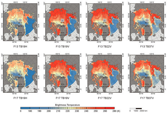 where, , , and the open water brightness temperature are the tie point values from open water and are used as constants, and for F13, whereas, and for F17 [19]. C is the sea ice concentration (SIC). In this paper, we calculated SIC of F17 and F13 based on NASA Team (NT) algorithm using the TB of the 19H, 19V, 22V and 37V channels [27], respectively. Furthermore, TB (22V) was used to make the weather filters in the NT algorithm. It should be noted that brightness temperatures observed by F13 and F17 are used to calculate SIC, respectively, and the bias and RMSE of SIC between F13 and F17 are 0.5% and 0.6%.
