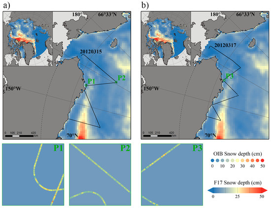 Transects of OIB SD measurements on 100% first-year sea ice. The background represents the F17 SD at 25 km resolution. (a) represents the transects on 15 March 2012, north of the Alaska, and the two transects across the F17 SD 25 km pixels (referenced P1 and P2); (b) represents the transects on 17 March 2012, north of the Alaska, and the two transects across the F17 SD 25 km pixel (referenced P3).