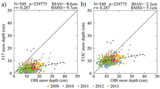 Comparison between satellites derived SD and OIB measured SD: (a) F17 snow depth vs. OIB snow depth; (b) F13C snow depth vs. OIB snow depth. F13C snow depths are derived from F13C TB which are the result of F17 TB calibrated to F13 using CA models according to Cavalieri et al. [19]. The solid line is the one-to-one fitting line, and the dashed line is the regression line of F17 or F13C to OIB snow depth and r refers to the correlation coefficient; N refers to the pixel’s number, and n presents the total OIB snow depth records in those pixels.