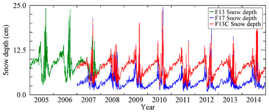 The OIB SD variability within a 25 km pixel in this paper is different from the values reported by Brucker et al. [10], who analyzed the two 12.5 km pixels of the two OIB SD transects over multiyear ice, with the mean SDs differing by 2–4 cm on 18 March 2011, whereas, the mean SDs differing by 1–3 cm on first-year sea ice was found in this study. The RMSE of F13C SD when compared with OIB SD is 5 cm, which is less than that in Brucker et al. [10], with the RMSE of 7 cm for the comparison of SDs that was acquired by the AMSR-E with the OIB SD.