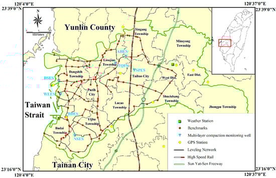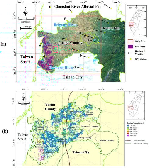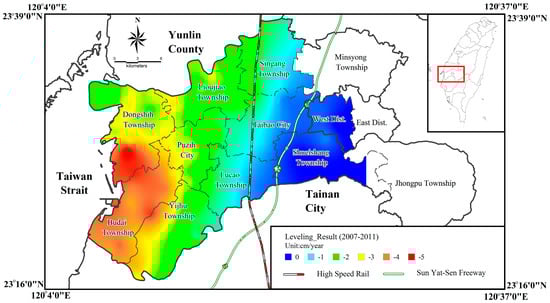 - Hung, W.; Hwang, C.; Chang, C.; Yen, J.; Liu, C.; Yang, W. Monitoring severe subsidence in Taiwan by multi-sensors: Yunlin, the southern Choushui River Alluvial Fan. Earth Sci. Geol. 2010, 59, 1535–1548. [Google Scholar] [CrossRef]