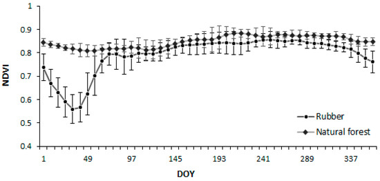 Temporal profiles of time series MODIS NDVI for natural forests and rubber plantations from 2001–2010, with error bars representing standard deviation. DOY = Day of year.