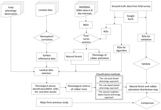 The rubber plantation and natural forest distribution maps were classified using the stacked Landsat data with three approaches. Both the rule-pixel-based phenology approach and rule-object-based phenology approach used the above decision rule (Figure 7). The thematic maps for the classification included three classes: natural forests, rubber plantations, and other land use types.