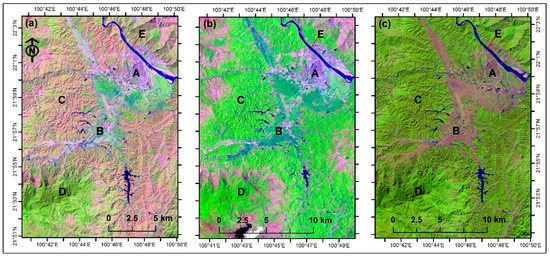 False color composition map (R/G/B = Band 5/4/3) of Landsat images (a) 19 February 2003, (b) 21 April 2002, and (c) 20 November 2001. The images of a small area show that the rubber plantation is readily visible as light green patches in the early foliation and late foliation stage (a), but the rubber plantation and natural forest are indistinguishable in (c), which is in neither the defoliation nor foliation stage. Several classes of interest were marked in the images, including built-up land (A), agricultural land (B), rubber plantation(C), natural forest (D), and waterbody (E).