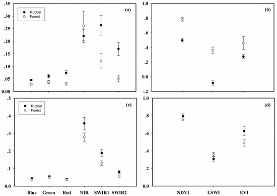 At the early foliation stage, SWIR1, SWIR2, NDVI, LSWI, and EVI were identified with a higher ability to separate rubber plantations from natural forests than the other indices and spectral bands (Figure 6). At the early foliation stage, SWIR1 (0.263 ± 0.039) and SWIR2 (0.169 ± 0.026) of rubber plantations were higher than that of natural forests, with figures of 0.123 ± 0.030 and 0.052 ± 0.013, respectively (Figure 6a). Additionally, the NDVI (0.467 ± 0.023), LSWI (-0.086 ± 0.031), and EVI (0.276 ± 0.026) of rubber plantations at the same phenological stage were much lower than the natural forests, with figures of 0.783 ± 0.024, 0.362 ± 0.043, and 0.460 ± 0.087, respectively (Figure 6b).