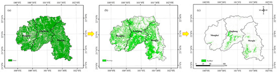 (a) The 30 m resolution forest mask, which was derived from the 50 m PALSAR data and then resampled at the Landsat scale; (b) the phenology feature layer of rubber plantations in the foliation stage by using the selected image in the late foliation phenology phase (21 April 2002). (c) The resultant rubber plantation map with a 30 m resolution generated by combining the forest layer and the rubber phenology feature derived decision rule.