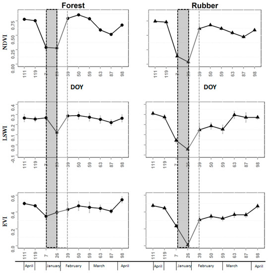 Temporal profiles of time series Landsat NDVI, EVI, and LSWI reflectance for natural forests, and rubber plantations. Twelve points of interest (POIs) were extracted for rubber plantations and 13 POIs for natural forests. The points and error bars show their average and standard deviation (SD) values. Rubber plantations and natural forests are evidently different in two typical phenology phases: defoliation (the gray long and narrow boxes) and foliation (the white long and narrow boxes).