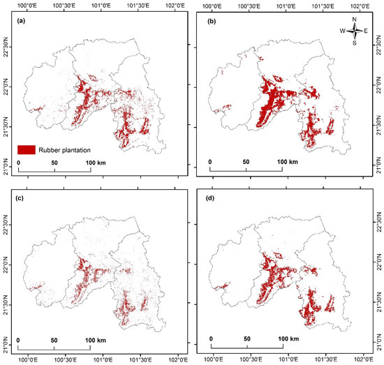 The resultant rubber plantation map derived by the rule-object-based phenology approach (a), the nearest-neighbor-object-based phenology approach (b), the rule-pixel-based phenology approach, (c) and the compared rubber plantation map developed by Xu et al. [13] (d).