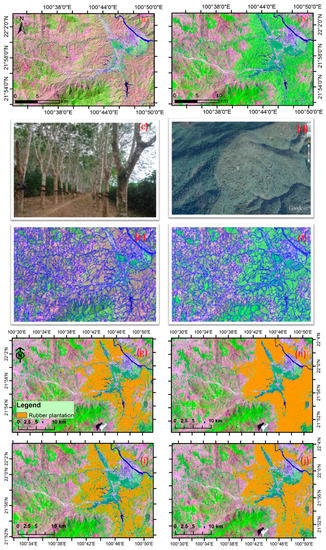 False color composition map (R/G/B = Band 5/4/3) of Landsat images (a) 19 February 2003; (b) 8 April 2002; (c) photo taken in the field; (d) image from high resolution images in Google Earth, with natural forests on the left and rubber plantations on the right; (e) segmentation of image (a); (f) segmentation of image (b); (g) classification of rule-object-based phenology approach; (h) classification of nearest-neighbor-object-based phenology approach; (i) classification of rule-pixel-based phenology approach; and (j) thematic map of Xu et al. [13].