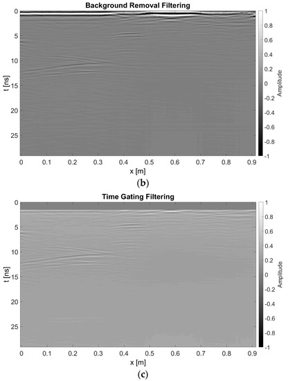Specifically, TD data processing begins with start time correction and involves procedures such as time gating (TG) and back-ground (BG) removal, which help to remove or mitigate the signal contributions due to antenna coupling, air-material interface and (undesired) horizontal reflectors [2]. Figure 2 shows an example of a raw radargram and its filtered version by means of the above-cited TD filtering procedures; such a figure is representative of the data taken as input for the microwave tomographic approach. Indeed, by taking into account the specific features of the investigated site (see Section 3) and, specifically, the fact that a satisfactory characterization requires the simultaneous imaging of both surface and deep objects, which could be either extended or point-like targets, both TG and BG removal are used, after which the time zero correction is performed (see Figure 2b,c).