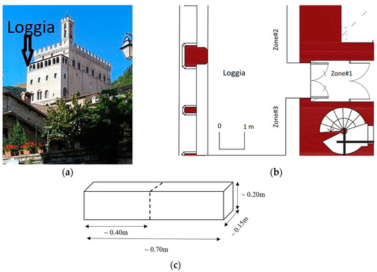 The other two investigated regions, i.e., Zone#2 and Zona#3, are located on the west wall of the Loggia (see Figure 3b). This wall is part of the outside perimeter of the Consoli Palace, and it is made up of parallelepiped stone blocks, see Figure 6a,b, that depict the two regions, respectively.