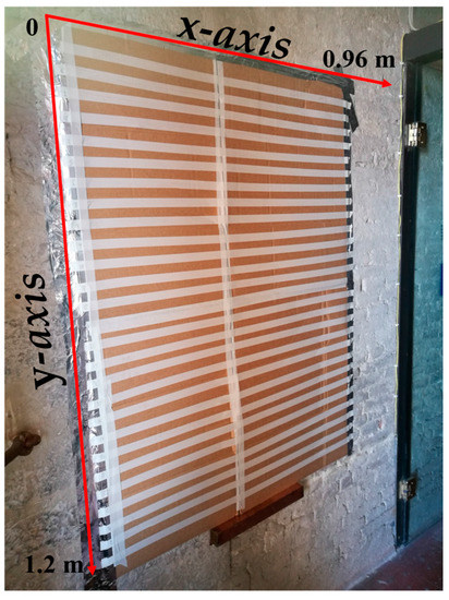 At the cross-hall leading to the Loggia, GPR data were collected on a surface of about 1 m2, whose side was 0.96 m along the x-axis and 1.2 m along y-axis, according to the coordinate reference system depicted in Figure 4. As Figure 4 shows, cardboard was applied on the investigated region during the measurement step. Data were gathered with a 0.01 m spatial offset by moving the antenna from left to right along the x-axis, and by considering 25 traces, spaced 0.05 m apart, along the y-axis.